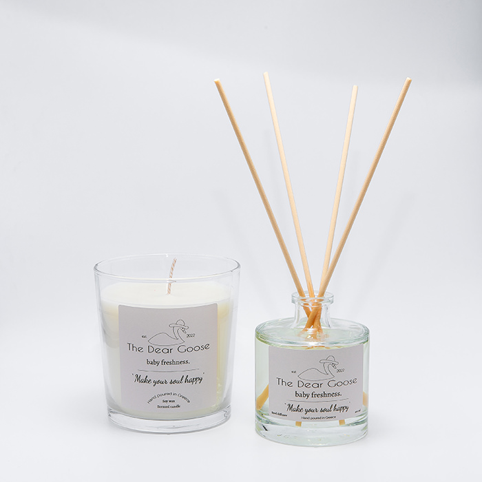 To ‘baby freshness.’ σετ κερί σόγιας και το αρωματικό χώρου με άρωμα πούδρας ενώνονται.