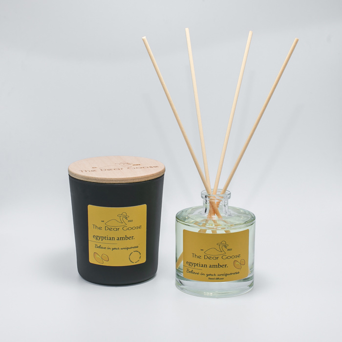 Το ‘egyptian amber.’, σετ κερί σόγιας και το αρωματικό χώρου με άρωμα amber ενώνονται.